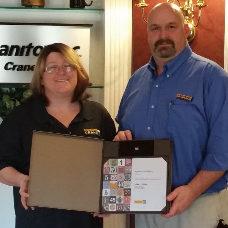 Rebecca Gaylor (Atlanta Crane Branch Parts/Sales/Service Expediter) receiving her award from Jeff Davis for completing 15 years of service Feb. 24.