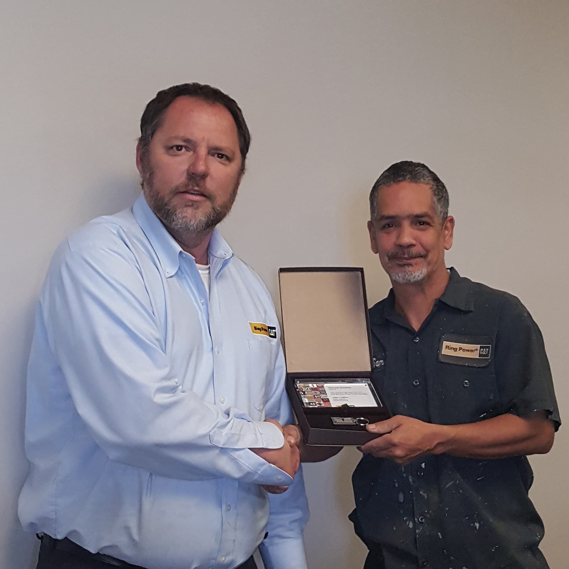 Roselio Mejias (Sarasota HE Parts Inside Sales Advisor) on the left, receiving his award from Richie for completing one year of service Jan 23.